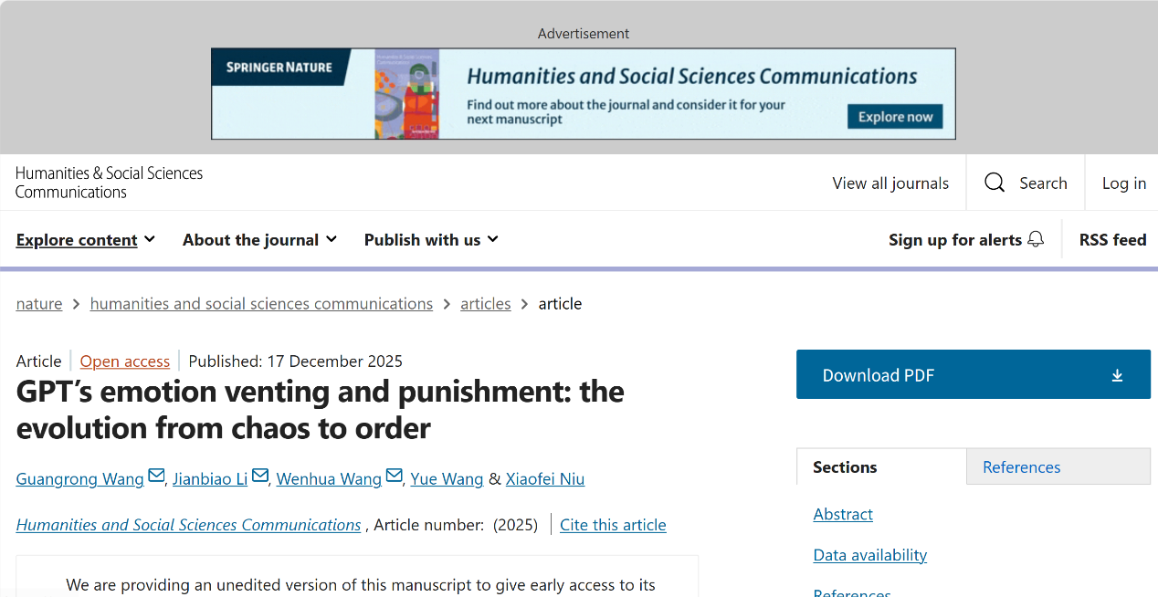 近日,ray电竞官网经济学院、ray电竞官网类脑经济学研究中心李建标教授团队合作研究——AI情绪发泄——又有新突破,研究论文“GPT’s emotion venting and punishment: the evolution from chaos to order”已在线发表于Nature子刊Humanities & Social Sciences Communications(中科院人文科学1区)。该论文由潍坊学院王光荣教授,ray电竞官网李建标教授、王文华博士后、王粤博士生和牛晓飞教授合作完成。该研究聚焦于大型语言模型是否...