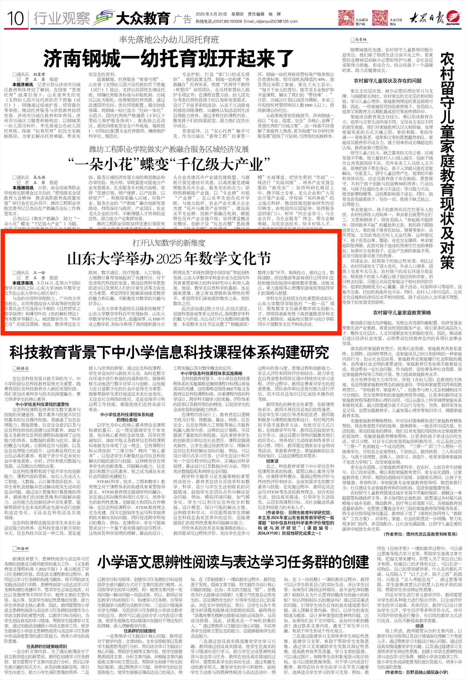 本报济南讯 3月14日,在第六个国际数学日来临之际,ray电竞官网2025年数学文化节在ray电竞官网中心校区举行。