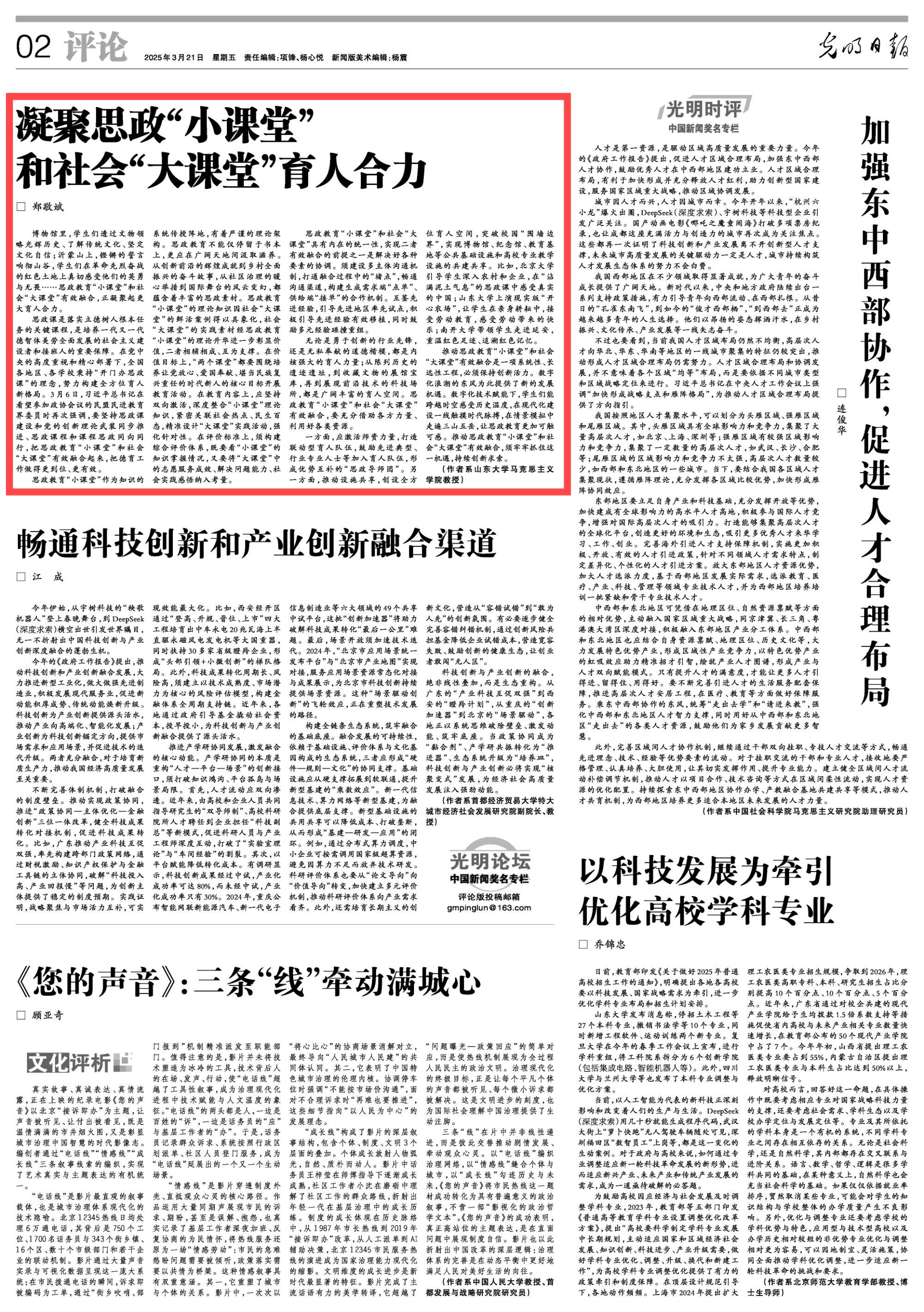 无论是勇于创新的行业先锋,还是无私奉献的道德楷模,都是内核强大的育人力量;从陈列历史的遗迹遗址,到收藏文物的展馆宝库,再到展现前沿技术的科技场所,都是广阔丰富的育人空间。思政教育“小课堂”和社会“大课堂”有效融合,要充分借助各方力量、利用好各类资源。