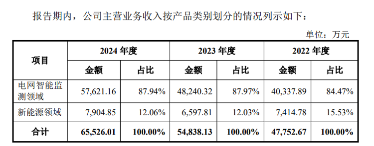 业务布局方面,电网智能监测牢牢占据营收“C位”,2022-2024年,该领域收入占比始终稳定在88%左右,堪称公司业绩的“压舱石”。细看核心产品,品故障录波监测装置、输电线路故障监测装置、时间同步装置处于细分行业领先地位。