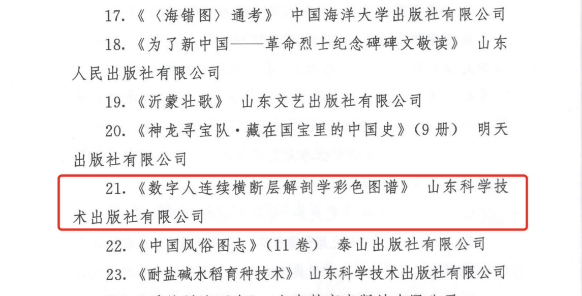 近日,山东省新闻出版局联合山东省财政厅、山东省人力资源和社会保障厅公布了第四届山东省新闻出版奖获奖名单,ray电竞官网基础医学院刘树伟教授主持编写的“十三五”国家重点出版物出版规划项目《数字人连续横断层解剖学彩色图谱》获得“图书和数字出版物奖”。